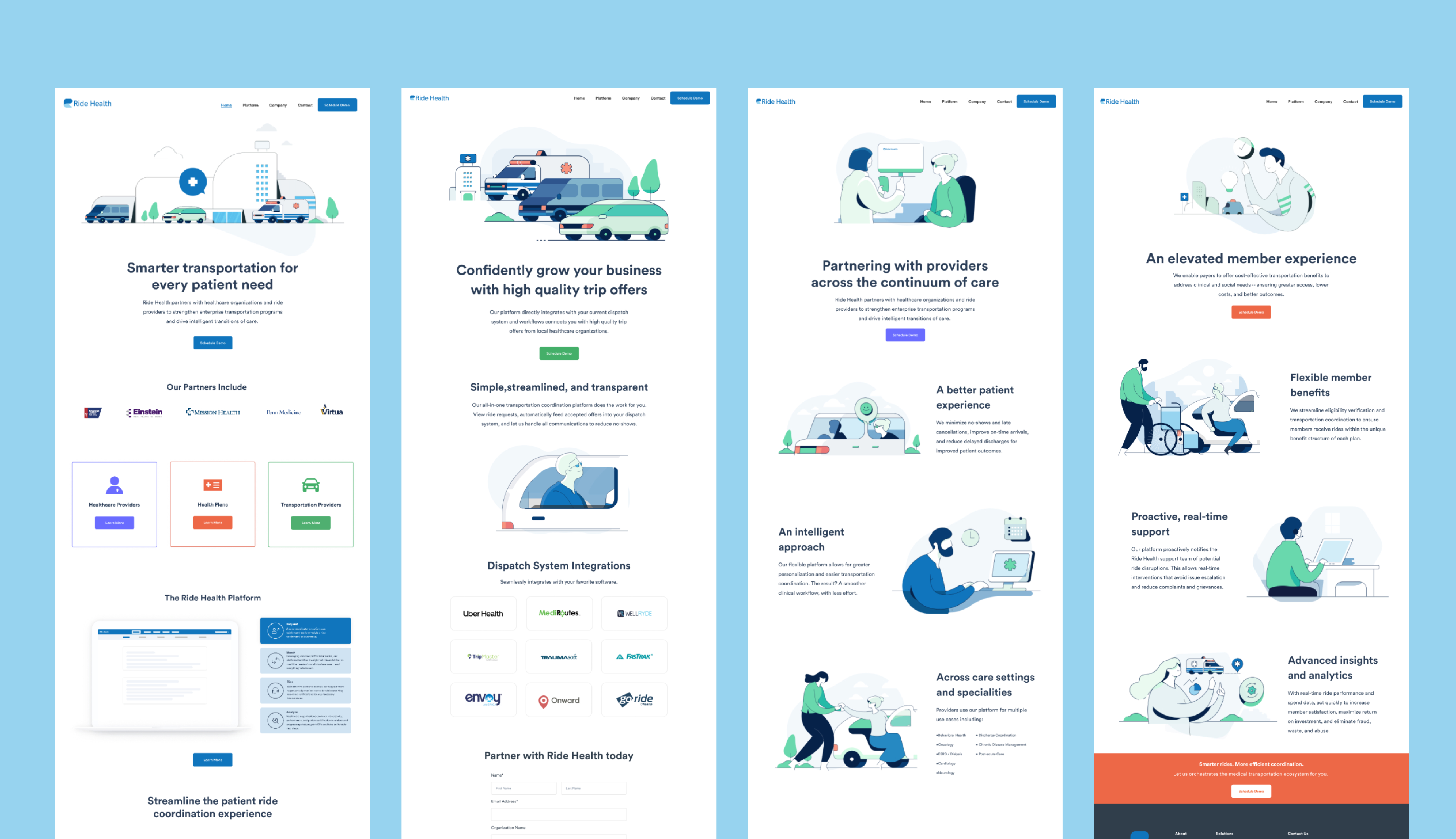 Ride Health is a New York-based startup focused on removing transportation as a barrier to healthcare. I was the first design hire, which meant building everything from scratch: product UI/UX, brand identity, and design system, while simultaneously establishing a design-first culture through weekly critiques and direct customer interviews. That user research loop directly informed product decisions and helped make the case internally for investing in design. The work contributed to a $6.2M funding round and measurable growth in app adoption. Full case study available upon request.