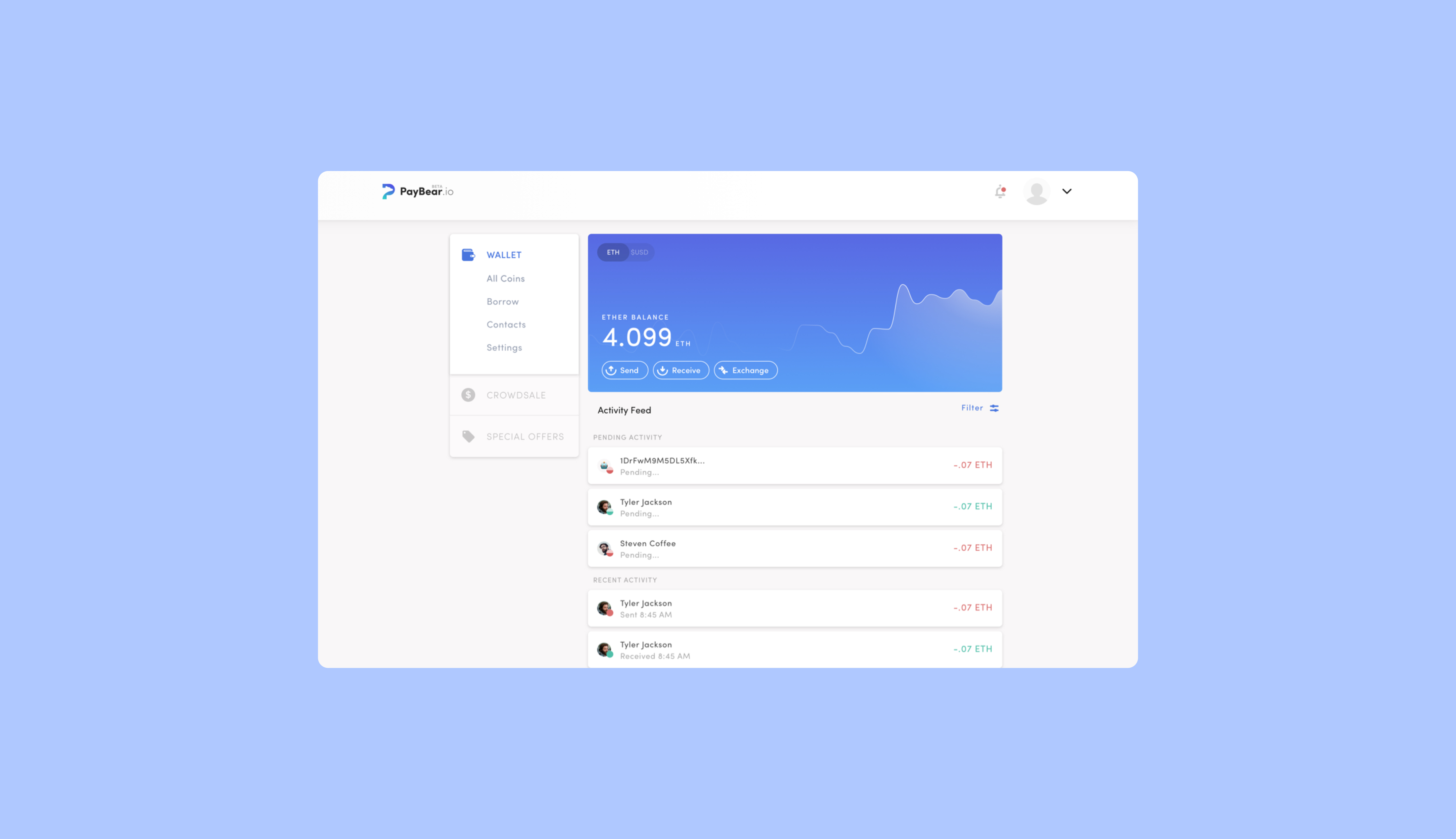 Savvy Crypto (formerly PayBear) had an ambitious vision: Coinbase and Stripe combined into one platform for merchants and consumers. I came in as one of the three early designers on the team, before the space had the institutional credibility it has today, and led design across both the merchant dashboard and the Savvy mobile wallet app from the ground up. The wallet covered send, receive, exchange, and fund consolidation, a feature built specifically for crypto's unique UX challenges, plus social payment features comparable to Venmo.